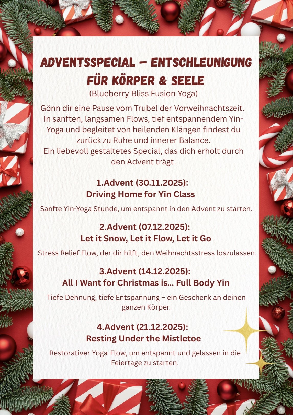 Ich sehe jede Yogastunde wie ein kleines Kunstprojekt: Für jedes Thema wähle ich passende Musik, Atemtechniken, Asanas sowie persönliche Geschichten und Worte. Somit möchte ich für jede Stunde eine besondere und inspirierende Atmosphäre schaffen.
